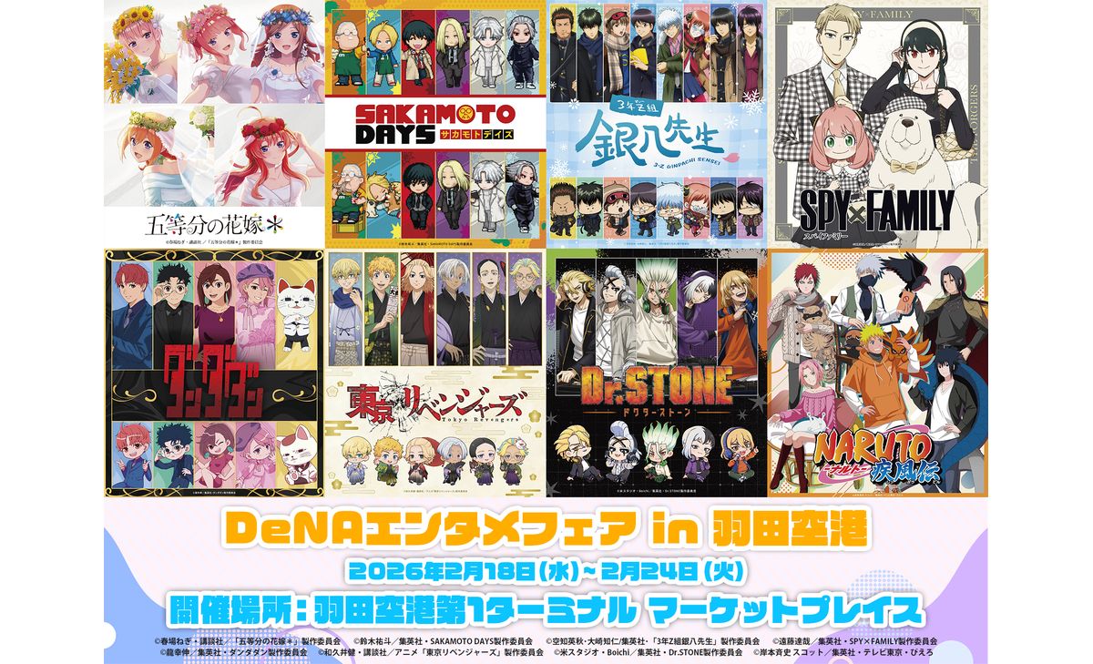 2月18日(水)~2月24日(火)の7日間、羽田空港第1ターミナル 2階 マーケットプレイスにて、人気アニメ作品のオリジナルグッズを販売するポップアップショップ「DeNAエンタメフェア in 羽田空港」を開催します。