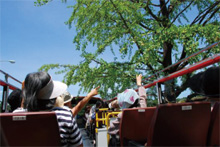 普段見慣れた風景も高さ3.8mのスカイバスに乗ると標識・看板、木々の枝葉が手の届きそうな距離に迫ってきたり、街の香りや音を体感できると多くのお客様から好評いただいております。